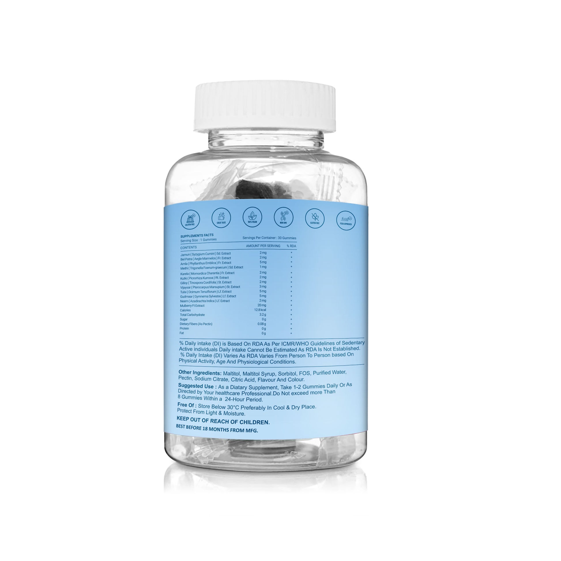 The unique herbal mix includes Gymnema Sylvestre, Bitter Melon, Fenugreek, Jamun Seed, Amla, Neem, Tulsi, Guduchi (Giloy), Cinnamon, Curry Leaves, Ashwagandha, and Turmeric – all known in Ayurveda for their role in blood sugar balance, insulin sensitivity, and antioxidant support.